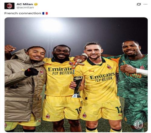 而拉比奥特的爆发,也是米兰“法国帮”集体发威的体现。本场除了他,恩昆库创造点球并罚进,迈尼昂稳健零封,福法纳踢满全场。米兰官方社媒赛后特意晒出四人合照,配文“法国帮”。这条中轴线(门将-中场-前锋)的稳定输出和默契,构成了米兰战术体系的国际纵队核心,他们的出色状态是球队战绩的硬保障。